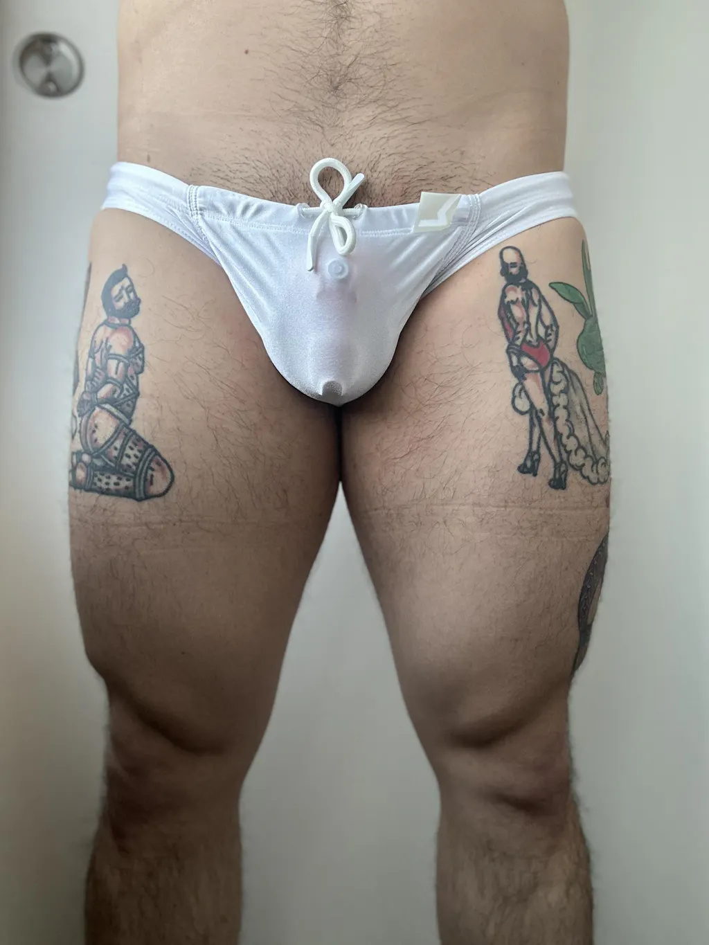 The swimwear is so comfortable, even with my chastity cage on! It hugs my thighs and butt really well and even dips a bit lower in the front to tease. Great to make me feel sexy and can’t wait to get it wet, maybe even at the pool 💦